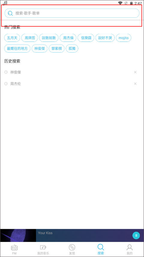5、这里提供的搜索功能很便捷,你只需在输入框里搜索歌手名字或者歌单名称,就能马上听到你想听的歌曲啦。