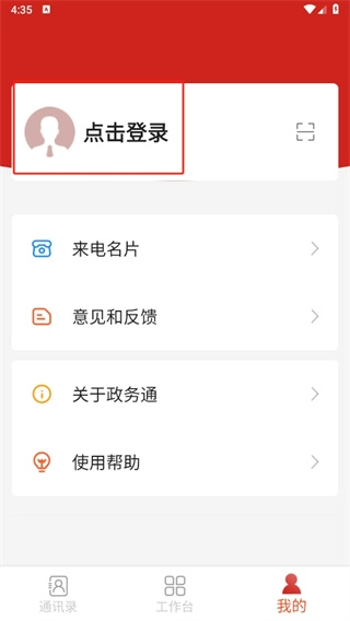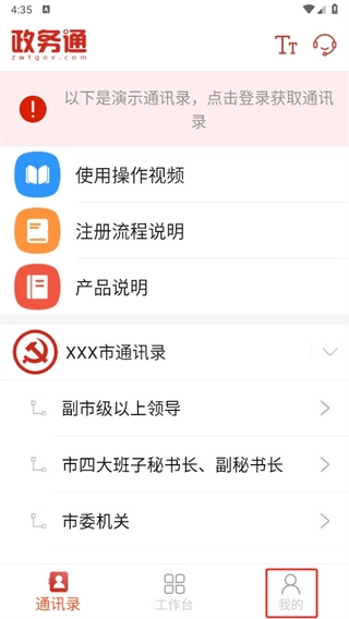 1、第一步是打开政务通应用,进入首页界面后,点击页面右下角的【我的】选项。