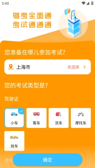 1、使用本站的博软驾培学员App时,第一步要选择所在地区和考试类型,例如我们可以选择小车这一类型。