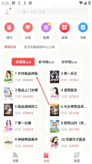 3、在书城页面点击【排行】按钮,就能查看热度榜等各类榜单,进而从中挑选小说。