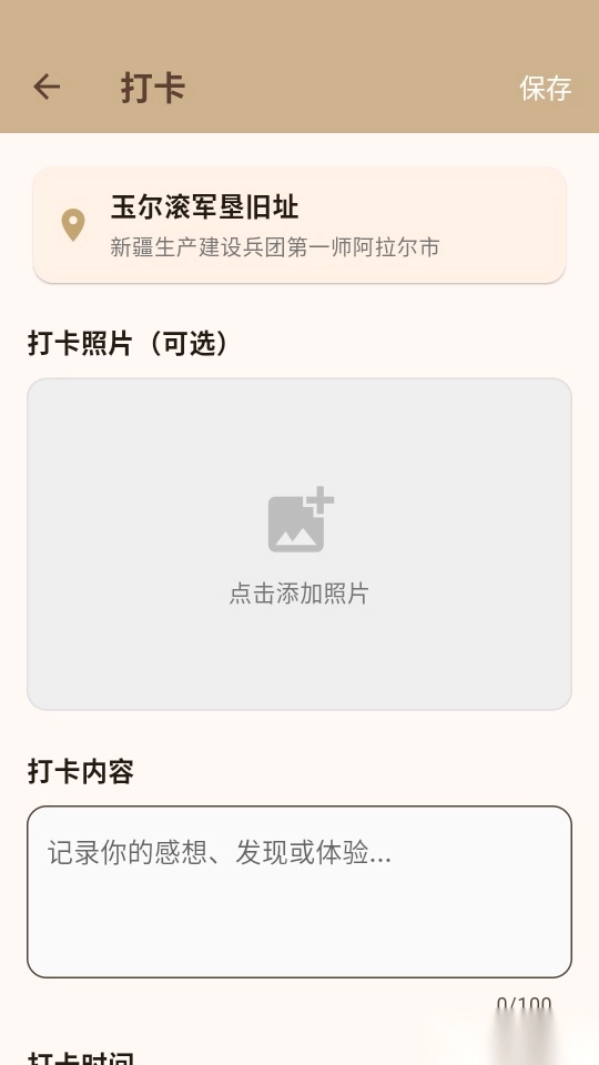 4、这样就能上传打卡照片,填写自己的打卡内容,点击右上角的“保存”按钮来即时保存。