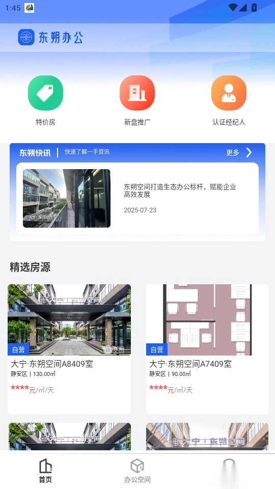东朔办公是一款汇聚海量房源信息的软件,各类房源信息在这里得到全面展示与推送。用户能随时便捷查找心仪房源并预约看房,还可随时联系房产经纪人进行实时沟通,向其咨询更多房源详情。同时,软件支持用户认证成为经纪人,开展房源销售办公,畅享专属服务,为经纪人日常办公提供全业务覆盖的支持,让在线办公更轻松高效。用户可随时查看在租房源信息,掌握出租动态,平台还推出众多特价房资源,方便用户随时查询,让找房看房更便捷。有需求的用户,不妨来体验东朔办公手机版!