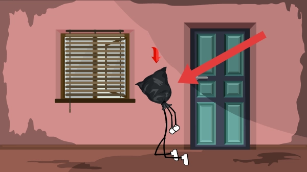 呈现火柴人角色(用袋子套头样式)在房间内尝试开门逃生的场景,属于火柴人冒险解谜常见的关卡情境,利用火柴人形象和密室逃脱玩法,推动玩家解谜闯关。