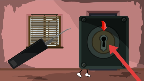 呈现火柴人借助开锁工具尝试打开带锁孔保险箱的解谜场景,这是常见的开锁解谜关卡环节,通过火柴人形象结合密室逃脱与道具解谜玩法,推动玩家解锁逃生流程。