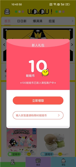 2、输入邀请码可以领取娃娃金币奖励