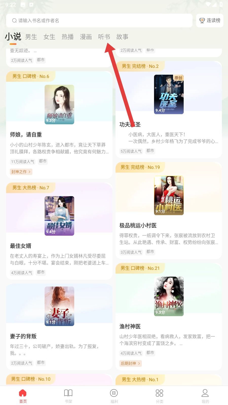 1、我们打开【连尚读书】,点击顶部的【听书】标签,即可进入听书板块。