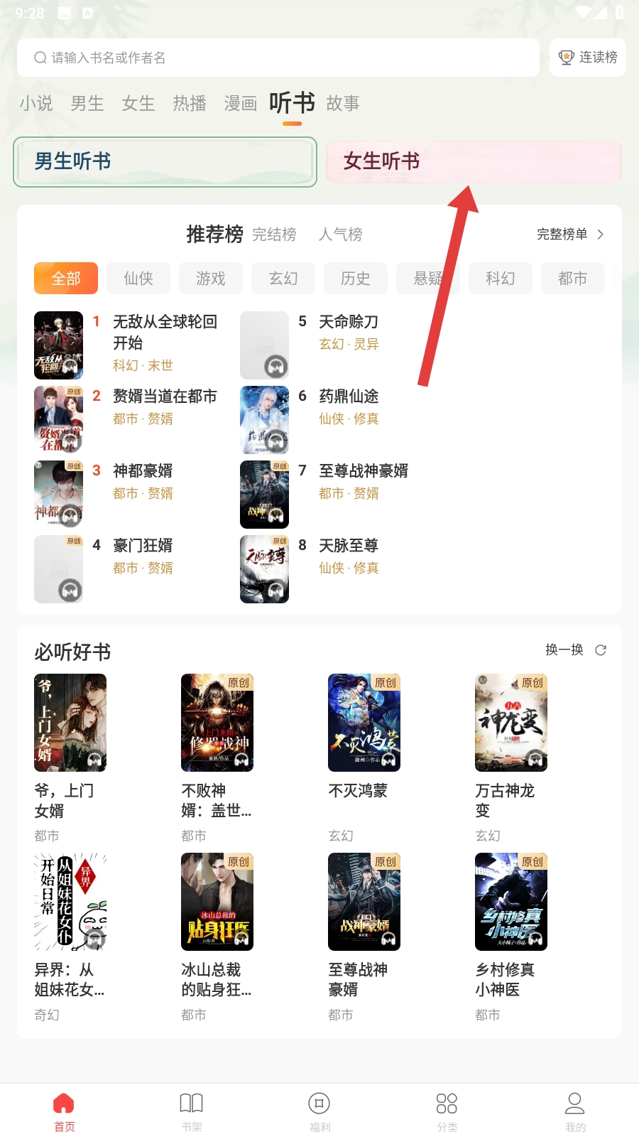 在听书板块中,点击【女生听书】标签,就能切换至女生听书分类,进而找到自己喜欢的听书内容啦。