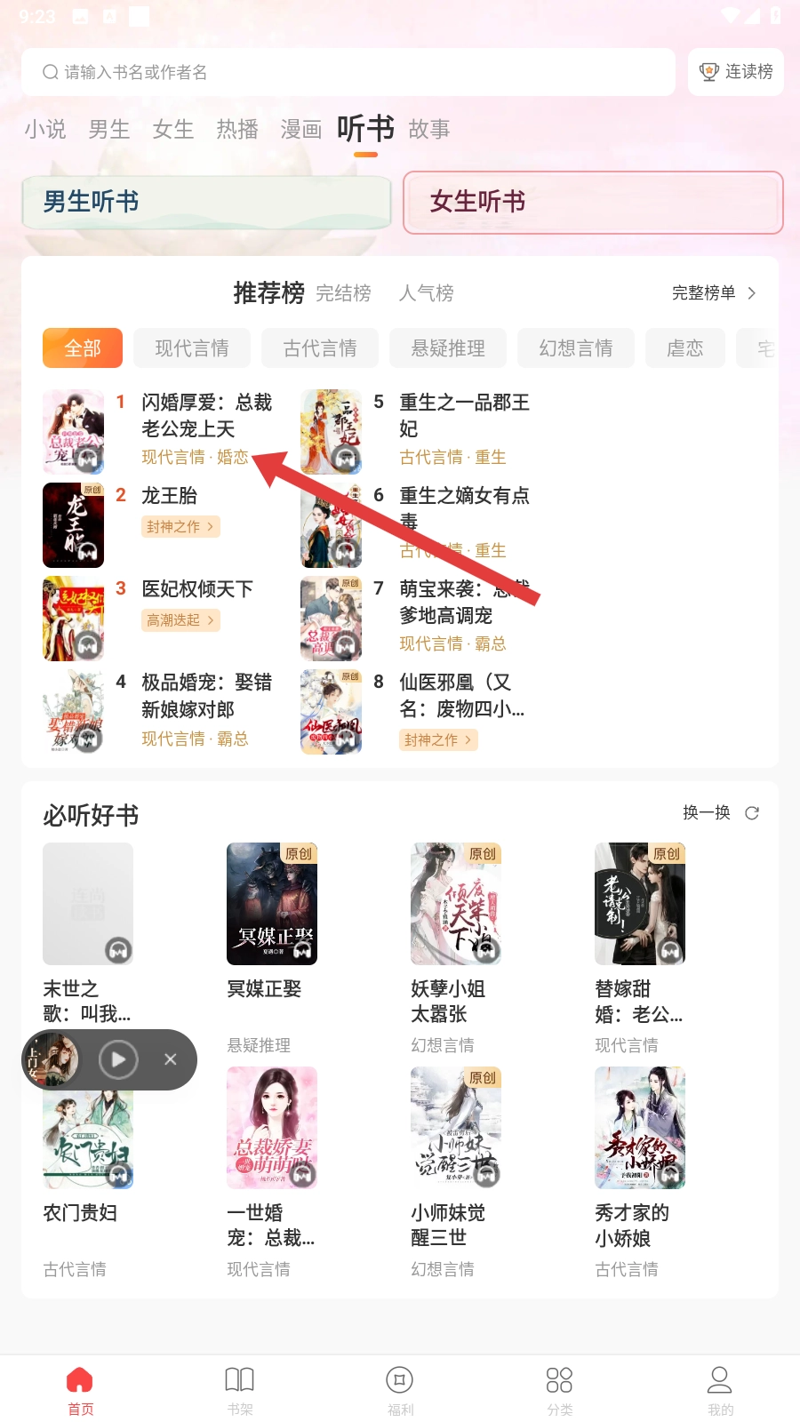 3、在女生听书分类中,挑选自己喜爱的听书作品,像《闪婚厚爱-总裁老公宠上天》这类,然后点击进入详情页面。