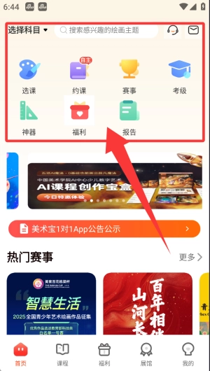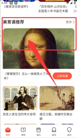 3、向下滑动页面找到美育拓展馆,根据学员的实际情况挑选对应的级别,选定级别后,直接在该级别课程列表页面完成兑换操作。