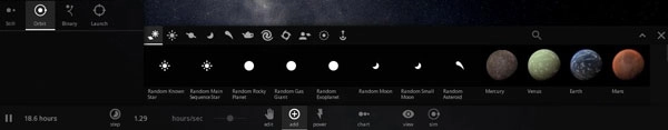 若要添加物体,只需点击“add”按钮,随后会弹出如下界面:在此界面中,可添加的物体类型包括行星、恒星、卫星、星系、黑洞、日常物品以及航天器等。你可以先点击目标物体,再将其放置到指定空间内;从理论层面而言,该空间能够容纳的物体数量不存在上限。