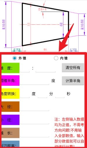 3、进入锥度计算模块后,仅需输入部分直径、锥长或角度等数值,系统就能自动计算出锥度或半角。