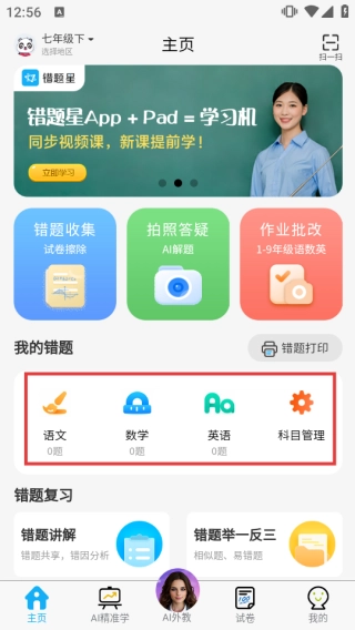 1、启动错题星App后进入【主页】,借助【错题收集】【拍照答疑】等功能辅助学习,通过【语文】【数学】【英语】等科目入口来管理各学科的错题。