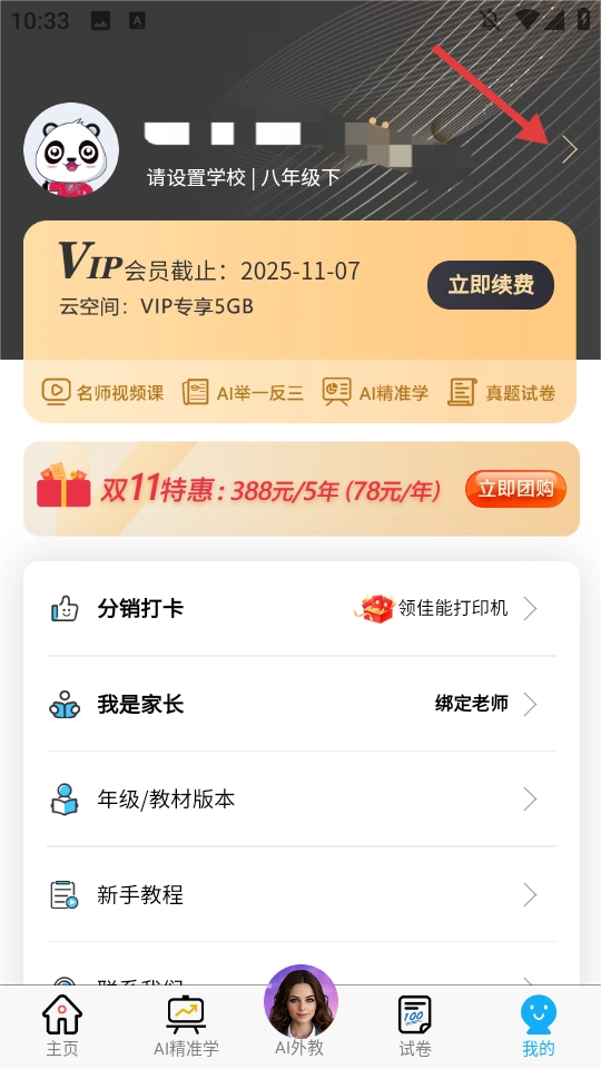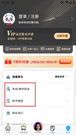3、进入【我的】页面后,可点击【年级】选项来设置对应的学习阶段,也能查看【新手教程】以熟悉App的使用方法,另外通过【登录/注册】操作还能体验到完整的功能。