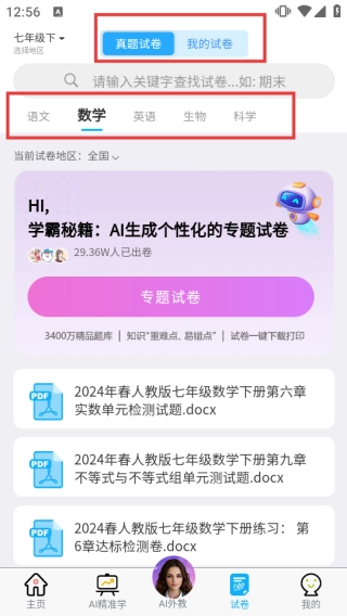 2、点击底部的【试卷】按钮,进入后在【真题试卷】栏目里,挑选【语文】【数学】等所需科目,查找对应的试卷,通过练习来提升自己。