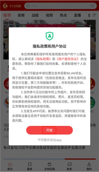 今日高邮是高邮市融媒体中心推出的本地新闻资讯平台,专注于展示高邮地区的各类动态。本地用户通过它能及时获取最新资讯,轻松知晓身边事。平台集成了新闻推送、政务办理、文明实践活动和生活服务等多种功能,全方位提升用户的日常生活体验。希望大家能借助今日高邮,发掘更多高邮的独特魅力,加深对这片土地的热爱!