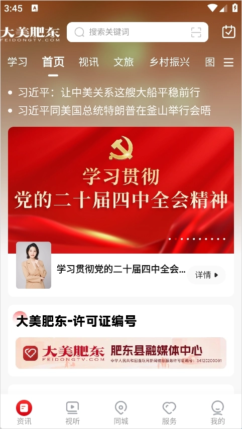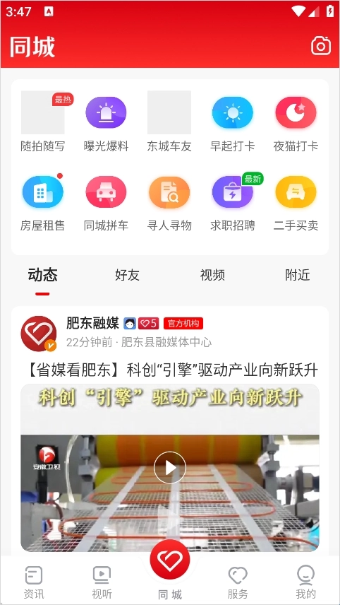 大美肥东是一款专为肥东县打造的生活资讯服务软件,集成了丰富的生活服务功能,同时提供当地新闻资讯与文化视频传播,致力于向用户展现肥东的独特魅力,让居民享受便捷的生活体验——无论是日常出行、天气查询,还是求职租房等需求,都能在软件上找到解决方案。