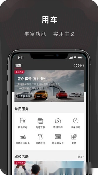 我们始终专注于客户的售后服务,致力于全力满足用户购车后的各类需求。通过多元化、多角度的服务模式,为车主提供切实贴合其刚性高频需求的实用功能,例如在线维修保养预约、道路救援、故障查询、违章查询等。这些功能将为奥迪车主的日常用车生活提供全方位的支持与协助,旨在让他们的用车体验更加安心、舒心。