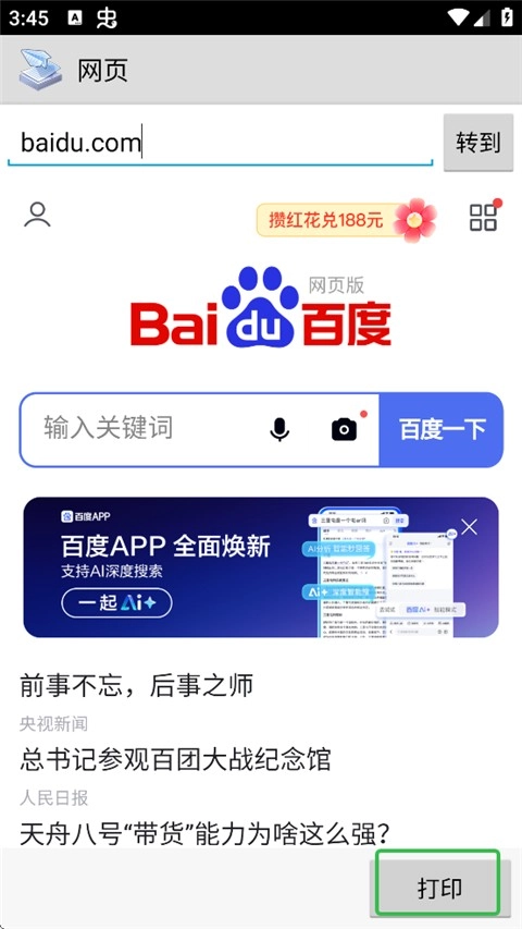 3、加载出百度页面后,点击打印。