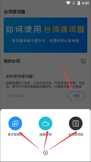 3、开启功能后点击使用,会弹出提词悬浮窗。因为悬浮窗是置顶显示的,所以打开任意拍摄软件时,都能看到悬浮窗里的台词。