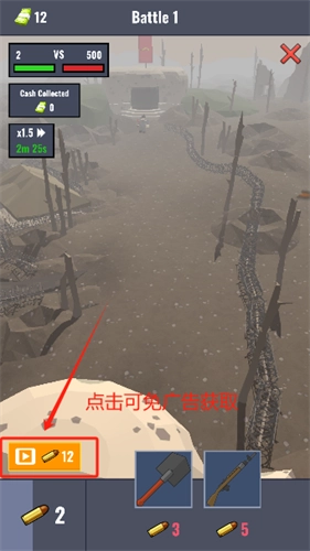 玩家在关卡中要通过消耗子弹来召唤部队参与战斗,点击橙色按钮就能获取子弹。