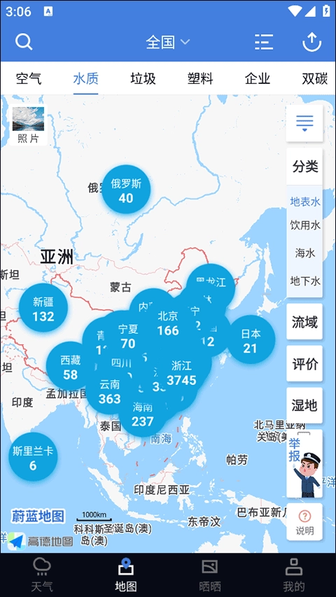 1、打开在本站安装完成的应用,进入地图界面后选择“水质”选项,就能查看水质情况了。
