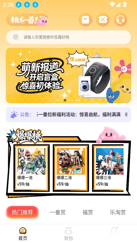 桃乐一番是一款专注于热门潮玩手办与谷子周边的盲盒抽赏应用,平台汇聚了海量充满惊喜感的盲盒商品,用户可在商城内自由挑选,随时开启趣味抽赏体验。购买盲盒后即可在线参与抽取,有机会获得心仪的潮流玩具与手办周边,轻松完成收藏。此外,用户抽取到的好物可暂存于背包中,随时选择想要的商品申请发货,享受便捷的配送服务;平台还涵盖了丰富多样的品类,支持用户按需筛选,实现一站式正品手办玩具采购。感兴趣的用户不妨即刻前往体验!