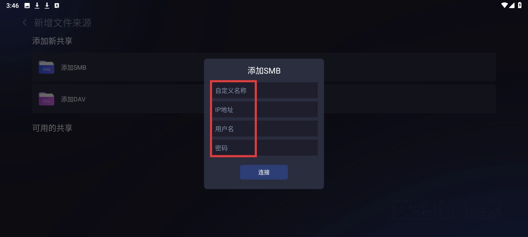 4、打开添加SMB的弹窗,依次填写自定义名称、IP地址、用户名和密码,随后点击【连接】按钮,即可完成SMB的添加操作。