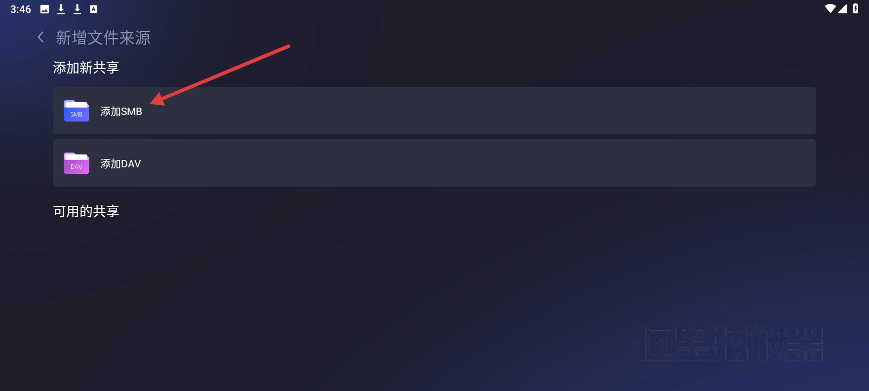 3、进入新增文件来源界面后,点击【添加 SMB】按钮,系统随即弹出添加 SMB 的输入框。