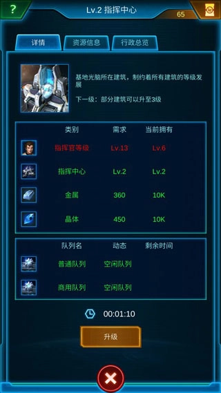 首升指挥中心,因为它制约着其他建筑的最高等级和部分功能的开启,资源充足且条件允许时就升级。有加速道具就使用;快完成时也可选择花费氪晶直接完成。
