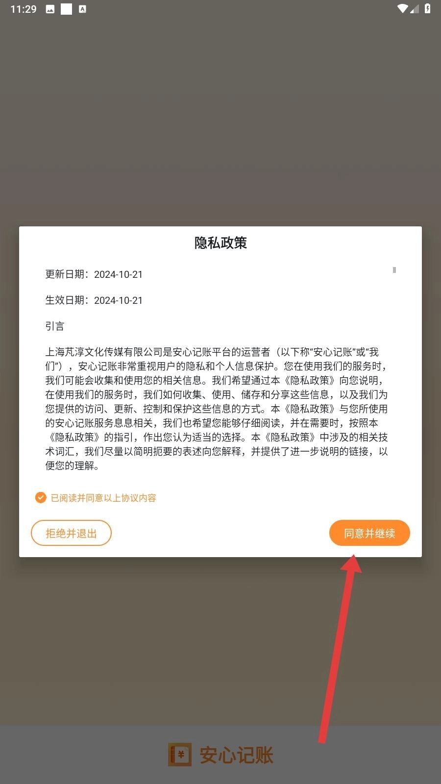 1、启动安心记账应用,页面弹出隐私政策提示框,认真阅读其中内容后,勾选“已阅读并同意以上协议内容”选项,再点击“同意并继续”按钮,即可进入应用的主界面。