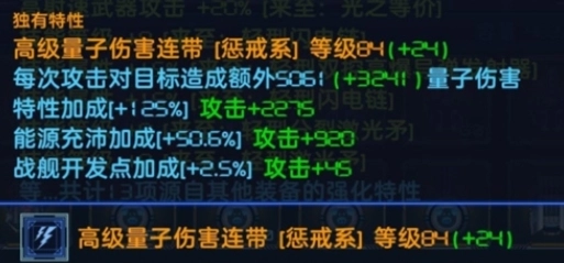 相信大家也能注意到后面的绿色字体,“+24”这一数值来自三门蓝色副炮的“技能等级+8”词条加成;特性加成源于蓝紫副炮的“技能属性加成”;能源加成则与船体能源的空余数量相关;至于科技点,基本可以忽略不计。