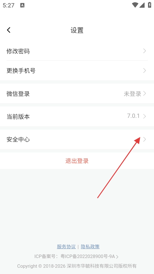 3、进入设置界面后,找到并点击【安全中心】选项,即可进入安全中心界面。