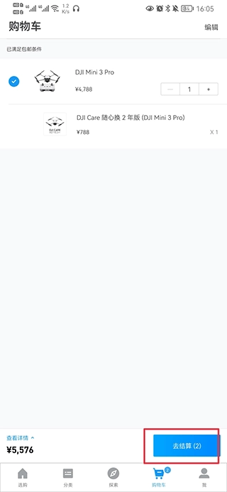 选择想要购买的机型,例如DJI Mini 3 Pro,然后点击加入购物车。