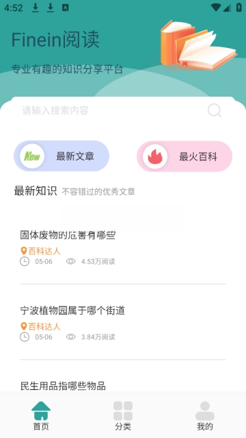 Finein阅读是一款能让你自由阅读的软件,内容堪称知识百科。这里的内容不仅有清晰标题,还做了详细分类,精准覆盖生活的方方面面。软件内容精彩、操作简单,点击即可阅读,是一款简洁实用的阅读工具。