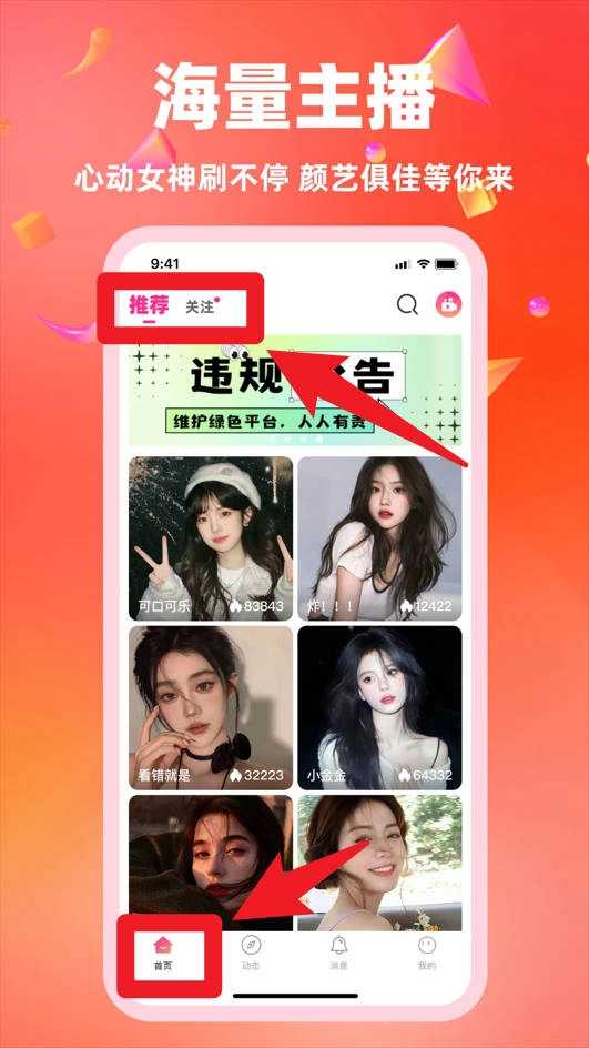 2、首页的推荐板块汇集了许多颜值出众的主播,用户能够点击心仪的主播,进入其个人主页或者直播间进行互动。
