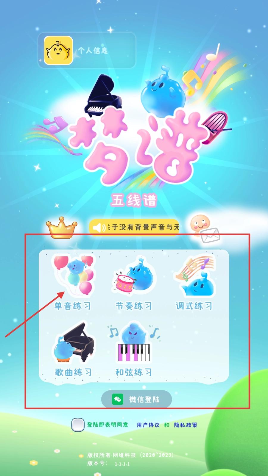 在【梦谱五线谱】的主界面中,你可以选择【单音练习】等各类学习模块,点击对应的模块就能进入学习环节。