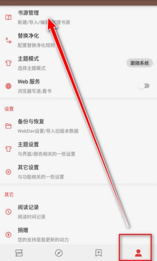 1、进入“我的”界面,找到“书源管理”选项。