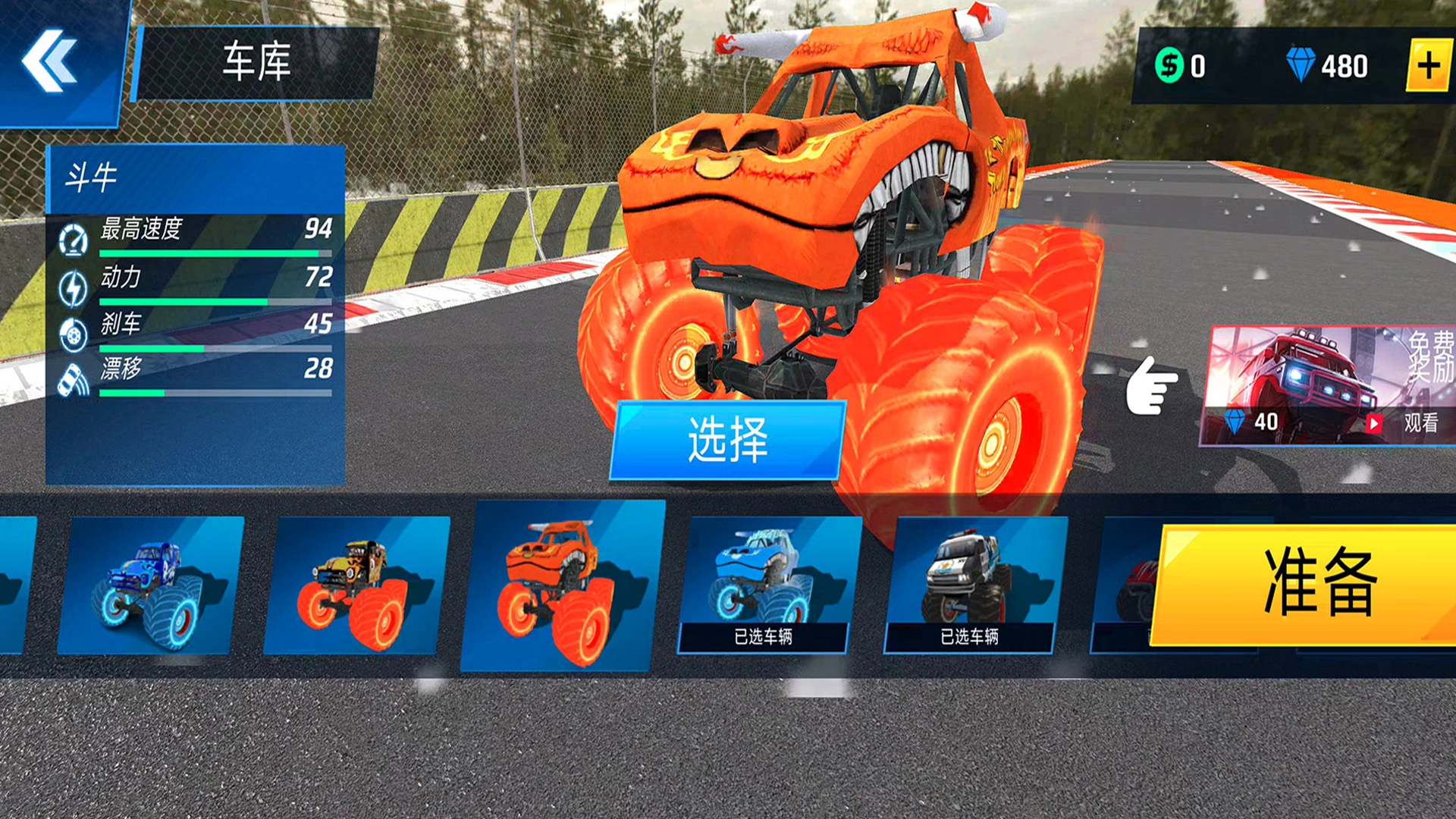 进入车库挑选卡车时,要关注速度、动力这类属性,选择能适配关卡的车型,并且可以对外观进行自定义设置。