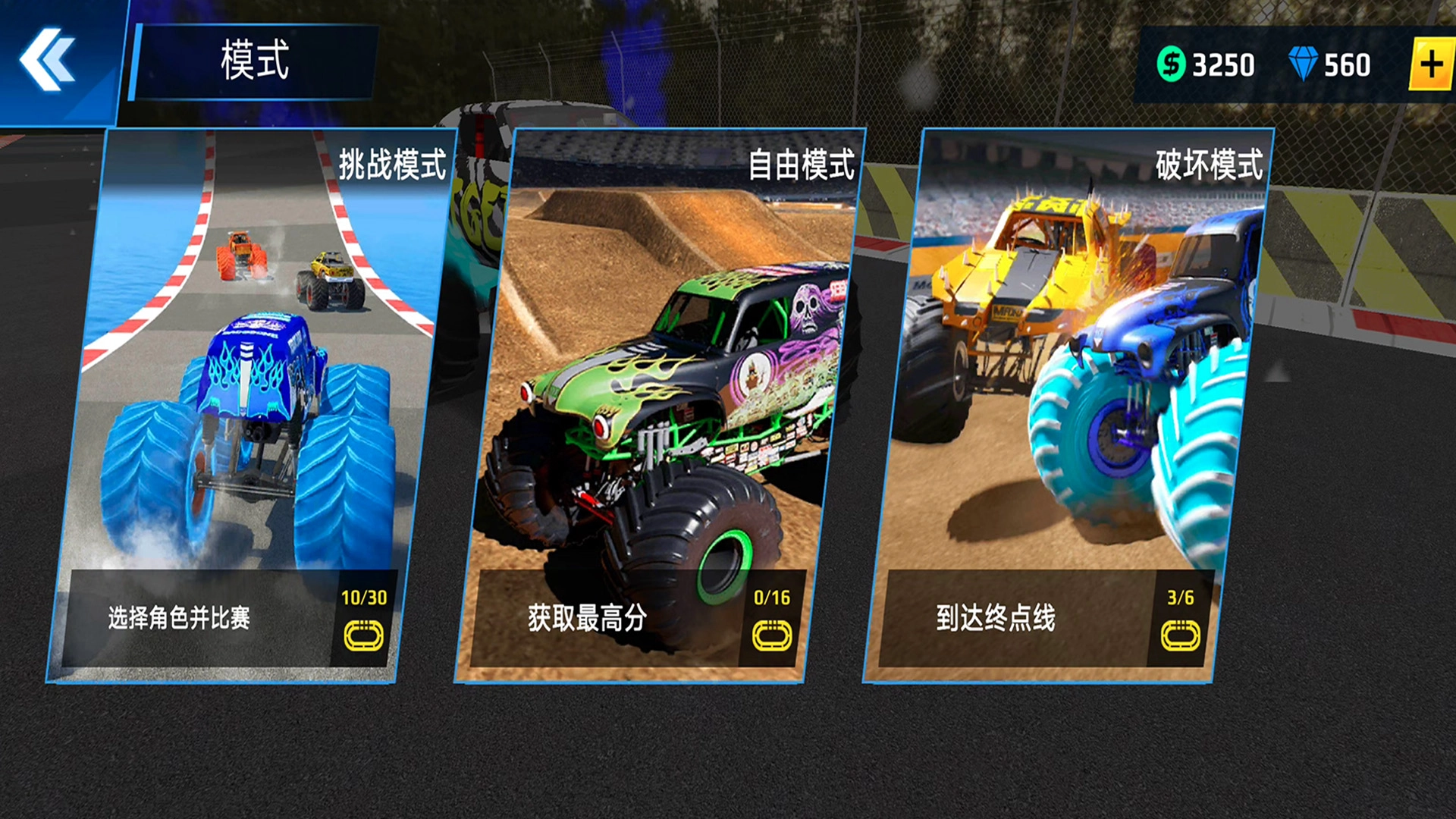 选择挑战、自由、破坏这三种模式:挑战模式需遵循规则赢得比赛,自由模式要冲击更高分数,破坏模式则以撞击终点为目标。