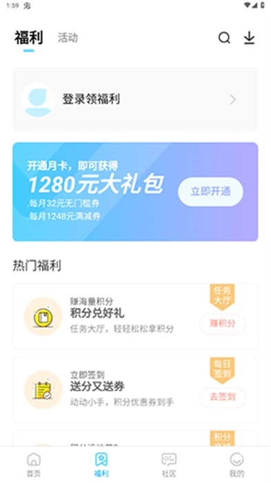 1、进入福利页面,点击【赚积分】和【抽大奖】按钮来启动任务系统