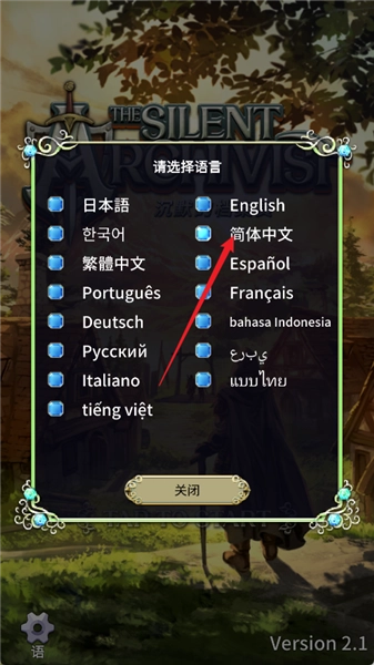 2、这里可以选择语言,我们就是【中文简体】,然后点击【关闭】,回到游戏开始页面,点击【TAP TO STATR】,开始进入游戏