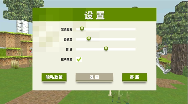 2、点击游戏里面的设置可以去查看里面的参数:渲染的距离、灵敏度的高低、音量大小、粒子效果等。