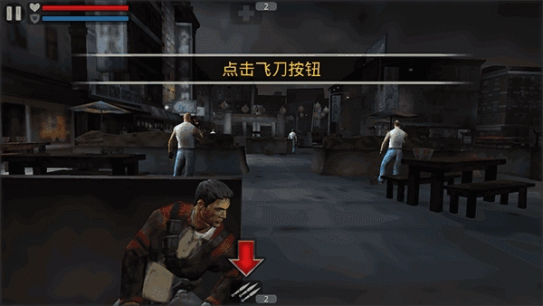 5、当血量补满后,系统会提示我们运用飞刀的技巧。飞刀属于消耗类道具,价格相对较高,不过威力十分强劲。只需点击目标敌人,投掷一把飞刀就能将其解决,其效果甚至比机枪还要出色。