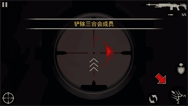 1、安装完成《杀手2:影子阴谋》手机版后,进入游戏时我们会处于天台场景,并且处于隐蔽状态。点击右侧的盾牌箭头图标,主角就会起身离开掩护位置。 2、能看到下方敌人数量不少,此时点击左下角的瞄准按钮即可。