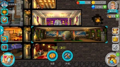 2、和多数建造类游戏的机制类似,本作里要升级各类基础设施,得先把主建筑的等级提上去——具体来说,得先升级王国大殿,才能升级军营。升级王国大殿后,系统还会解锁新的可建造建筑,像餐厅、宝库、居住室这些都包含在内。在《喧闹的城堡》这款游戏里,宝库的作用是持续产出金币并提高金币的生成效率,而金库则是专门存放金币的仓库:宝库等级越高,金币的获取速度就越快;金库等级越高,能储存的金币上限也就越大。同理,餐厅是负责产出苹果等消耗品的设施,提升它的等级同样能加快这些消耗品的获取速度。