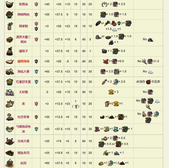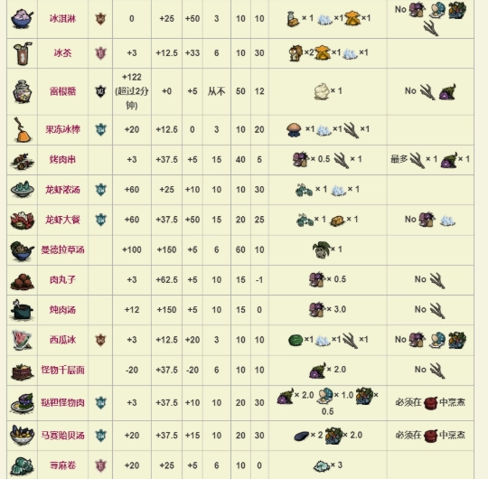 从第一张图里能看出,回血效果最突出的是曼德拉草汤、火龙果派和华夫饼这三样。不过曼德拉草汤虽说回血量大,可它的原料实在太稀缺了——一张地图上能找到三株曼德拉草就已经算运气好了。相比之下,火龙果派成本低,吃的时候还没有停顿动作,完全称得上是回血食物里的首选。