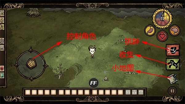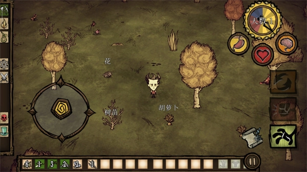 4、游戏随即正式启动,左侧区域用于操控角色的移动方向,右侧则对应资源收集功能,玩家需尽可能搜集所有可利用的资源,以此来规避饥荒危机。
