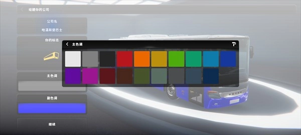 3、接下来要成立一家公司,确定公司名称、公司标识、车辆颜色等信息,确认无误后点击继续;
