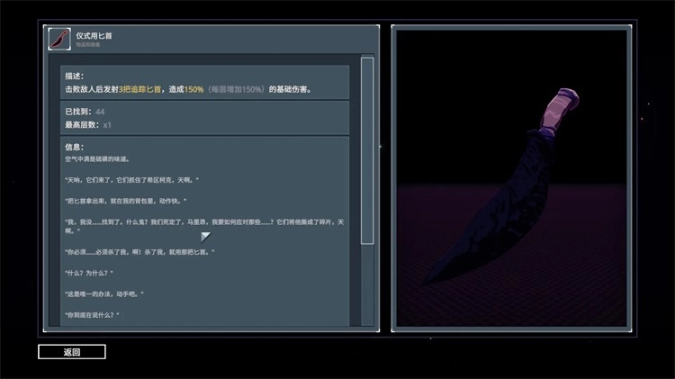 敌人被击败后会掉落三把小刀,这些小刀会自动朝着其他敌人飞去,带来150%的伤害。和“巫毒娃娃”一同使用时效果非常好,很适合用来清理小怪,不过在对付boss时作用不大。