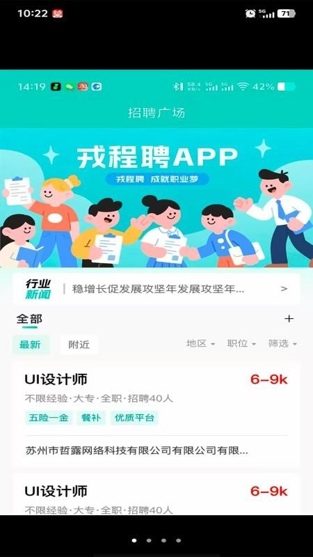 戎程聘是一款专为退伍军人开发的求职招聘应用,用户能在这里便捷获取大量招聘信息,依据自身专业匹配合适岗位,在线提交简历,助力快速入职,轻松就业困境;平台汇聚了UI设计、电焊工、销售、检测员、行政办公等丰富多元的职位资源,一站式提供求职就业服务,用户可在线查看职位详情,了解职责与待遇,高效筛选岗位,满足求职需求;此外,用户还能实时追踪沟通进度和简历投递状态,及时获取面试及入职通知,避免错过机会,确保求职过程无忧;有需要的用户,欢迎使用戎程聘软件!